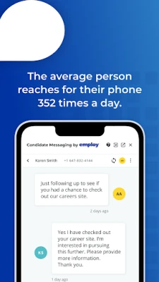 The average person reaches for their phone 352 times a day. Stay in touch with candidates who prefer mobile communication and speed up your hiring process with Candidate Messaging by Employ. • Create an Engaging Candidate Experience: Stand out from the competition by shifting email conversations to text. Engage modern applicants with gifs, emojis, and concise messages. • Accelerate Your Time to Hire: Coordinate interviews, send quick follow-up, and automate communications throughout your hiring workflow, shaving hours off your team’s work week. • Expand Your Messaging Strategy: Connect with multiple candidates simultaneously to maximize your reach and keep your talent pool engaged.