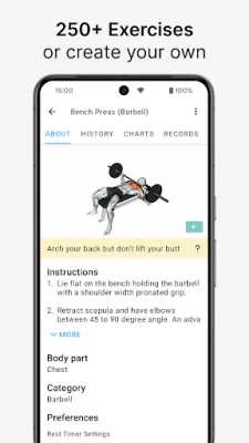 • Advanced Statistics show your personal records and progression and even calculate your one rep max and total weight lifted!