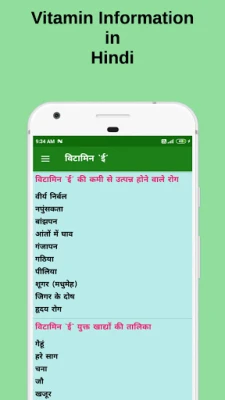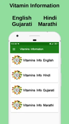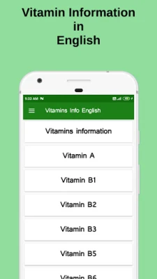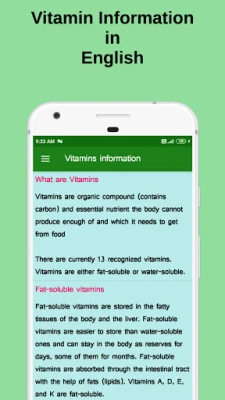In Vitamin Information app covers the following Vitamin Introduction Food introduction Protein Introduction Vitamins information Vitamin A Vitamin B, B1 to B12 Vitamin C Vitamin D Vitamin E Vitamin H Vitamin K Vitamin P Acidophilus Arsenic Bee-Pollen Blue Green Algae Boron Calcium Coenzyme Q10 Iron Lecithin Magnesium Melatonin Potassium Salty foods Unit of food-groups Instructions on healthy eating